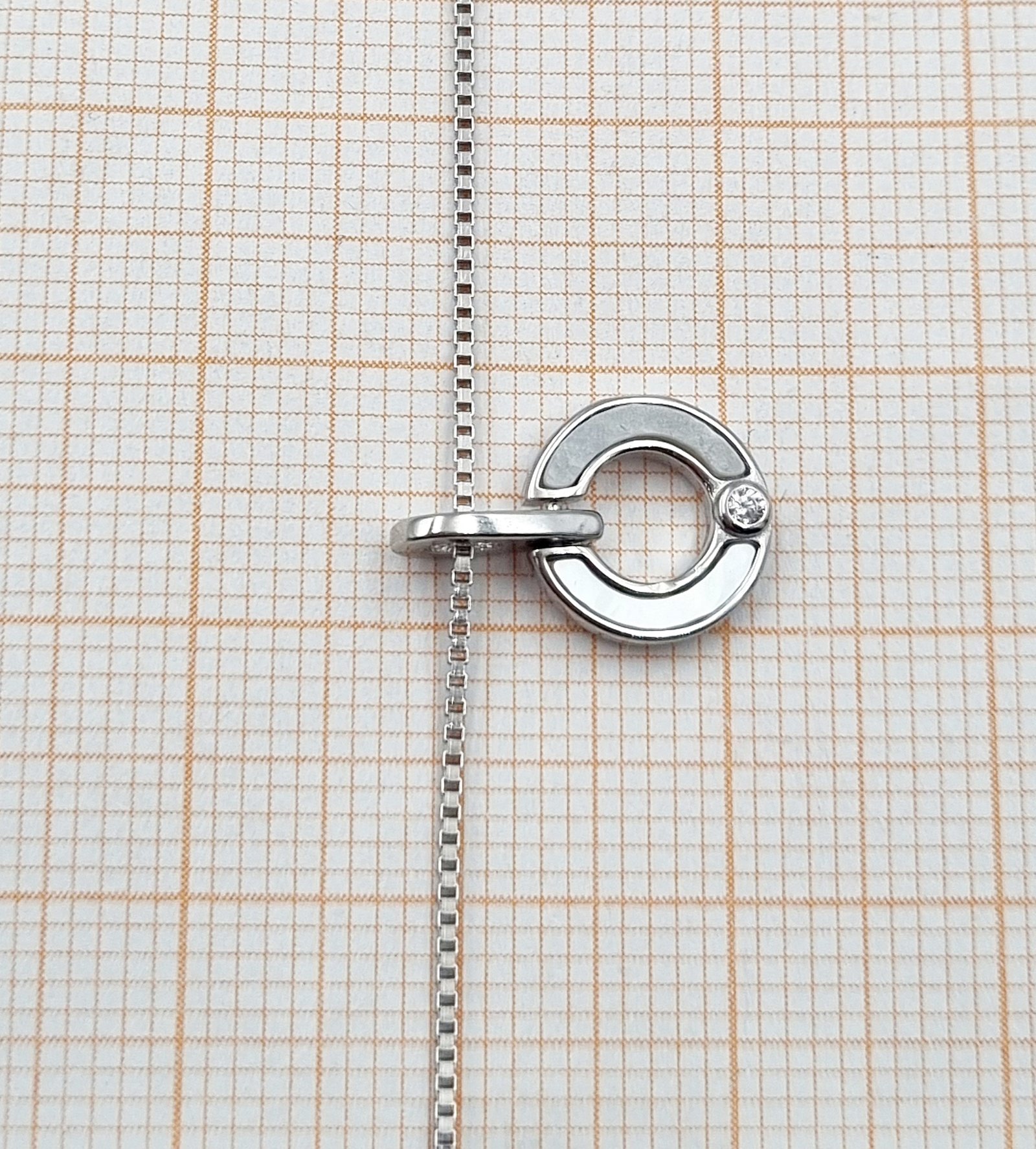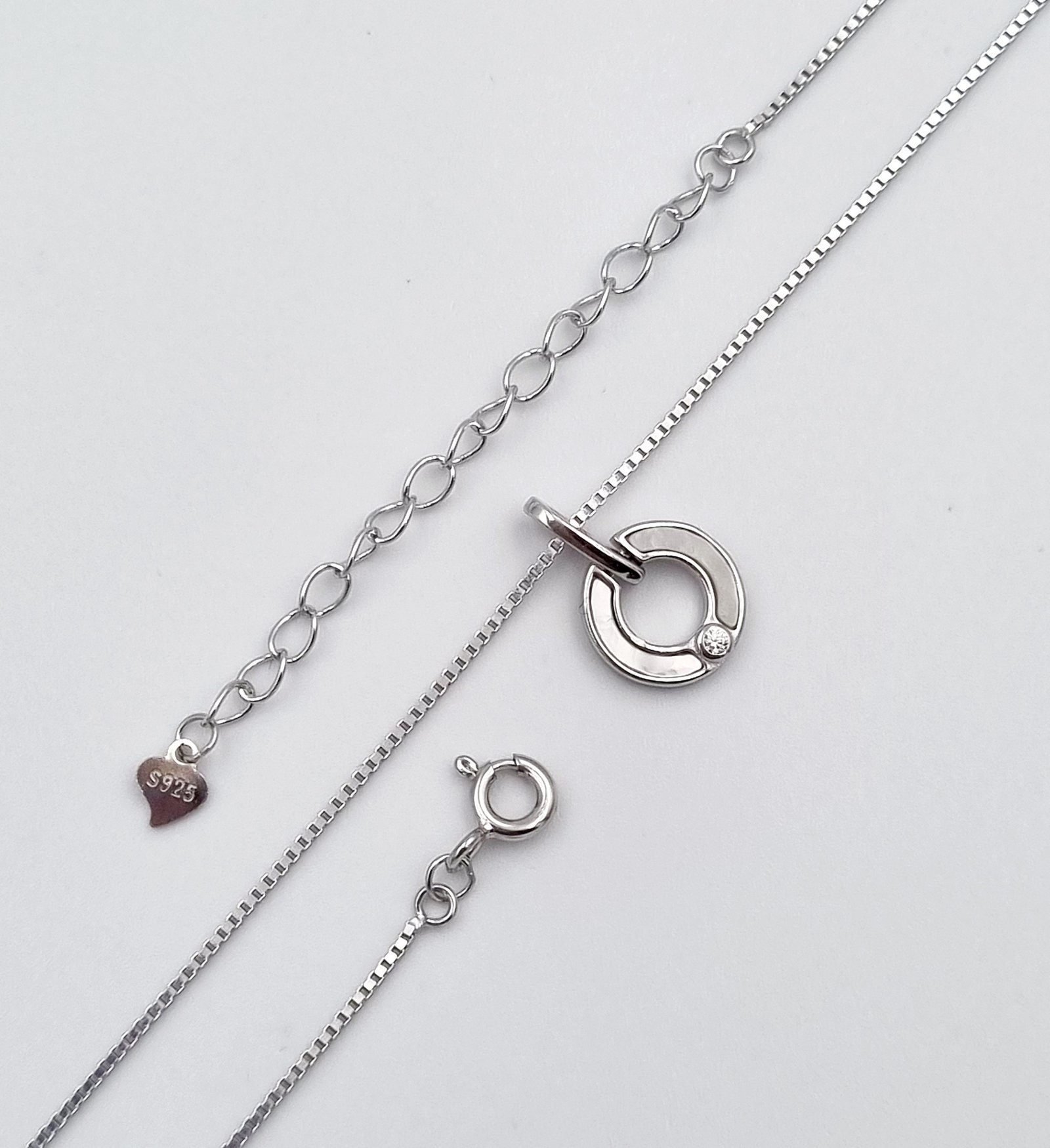 Sidabrinė rodžiuota grandinėlė su cirkonio akute ir perlamutru.